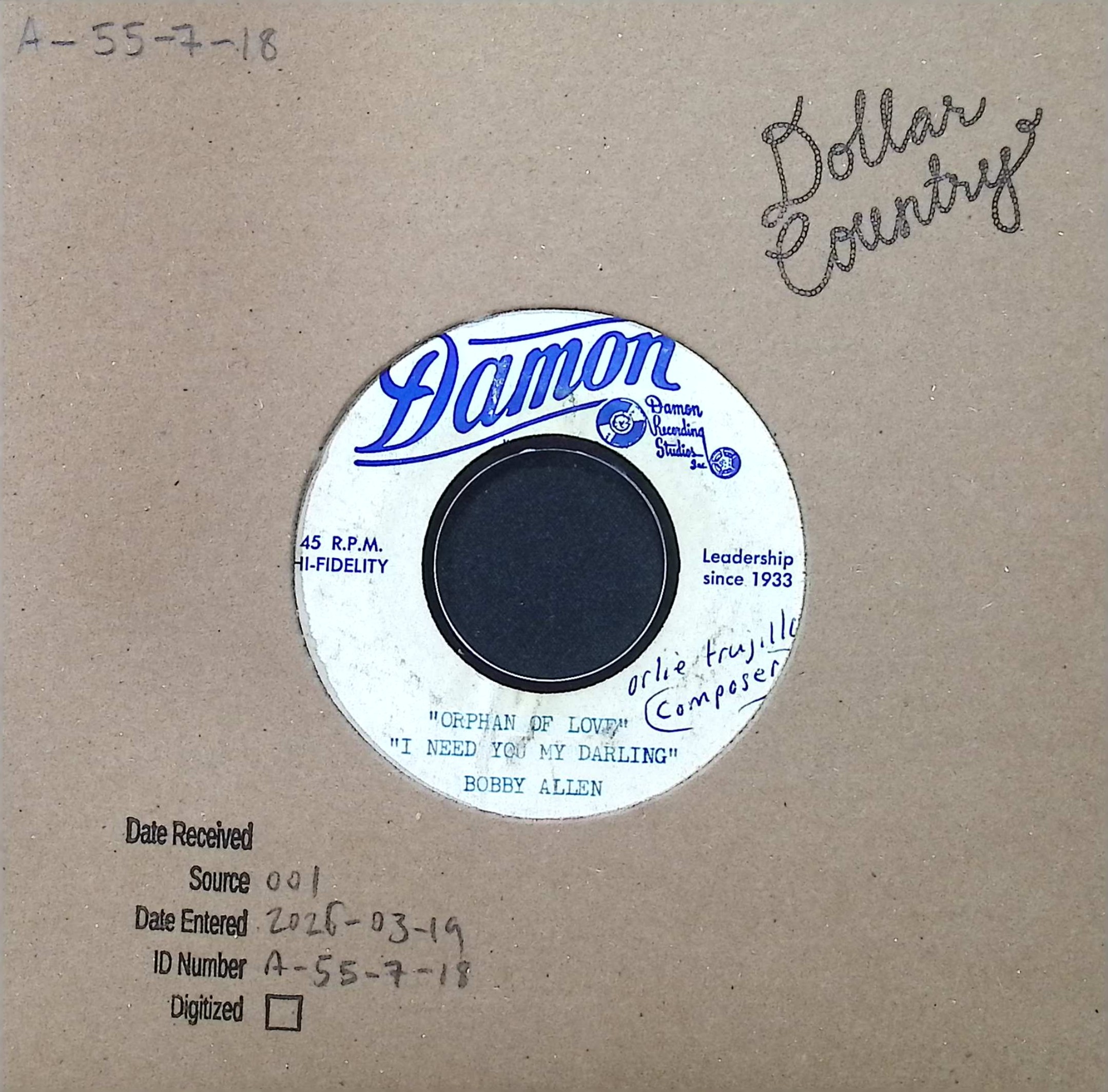 Bobby Allen - Orphan Of Love , I Need You My Darling / Don't Let Her Leave, Angels Shouldn't cry, accessed March 20, 2026, https://dollarcountry.org/items/show/31659
